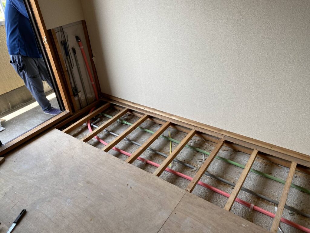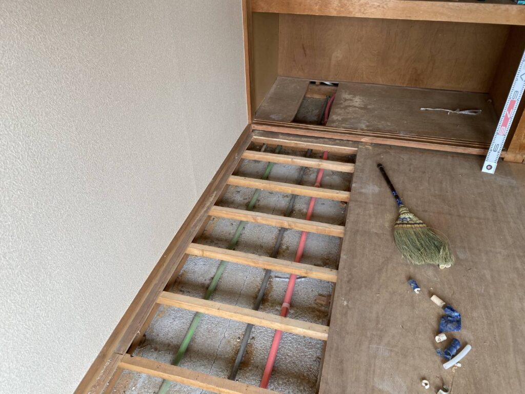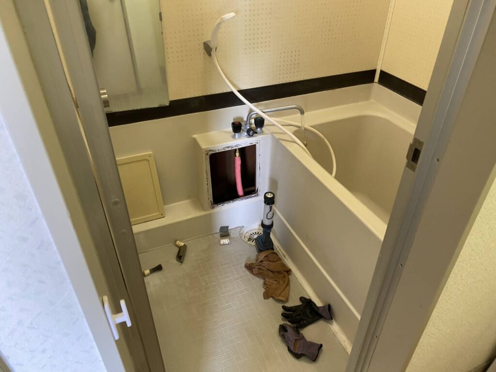 古くなって漏水した給湯器配管を撤去し、新しく配管工事を行いました。